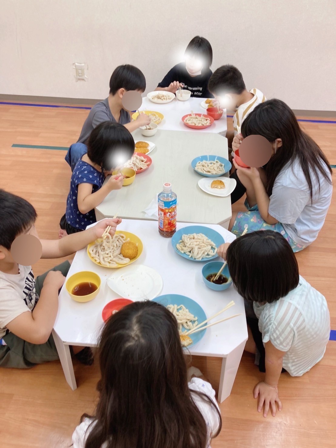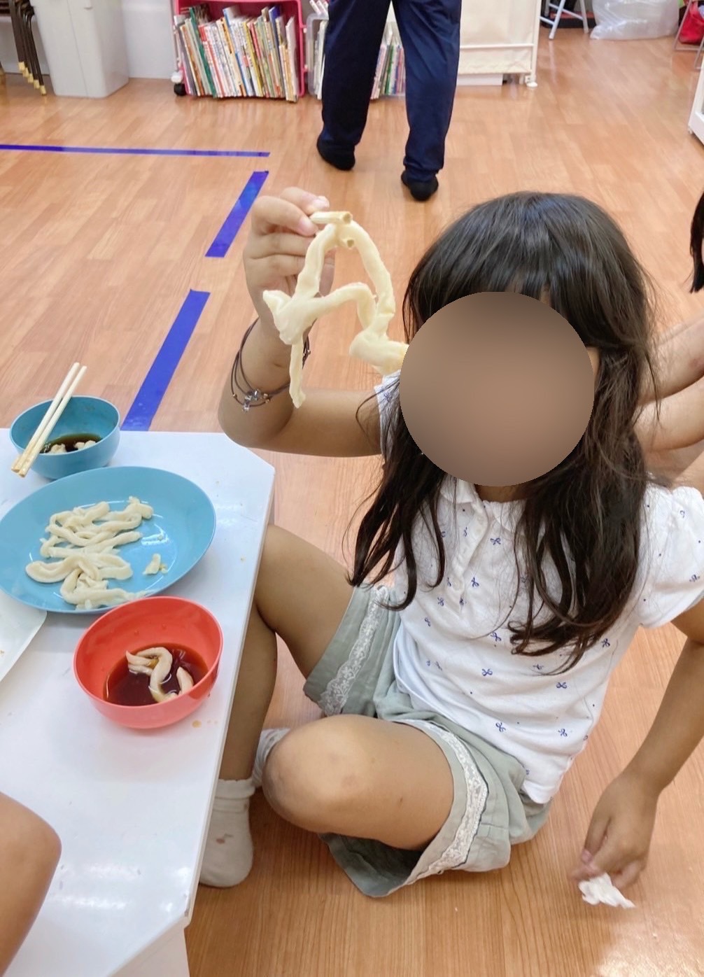 午前中は、みんなでうどん作りに挑戦! 粉からこねて、切って、茹でて… 自分で作ったうどんは、格別においしかったね!
