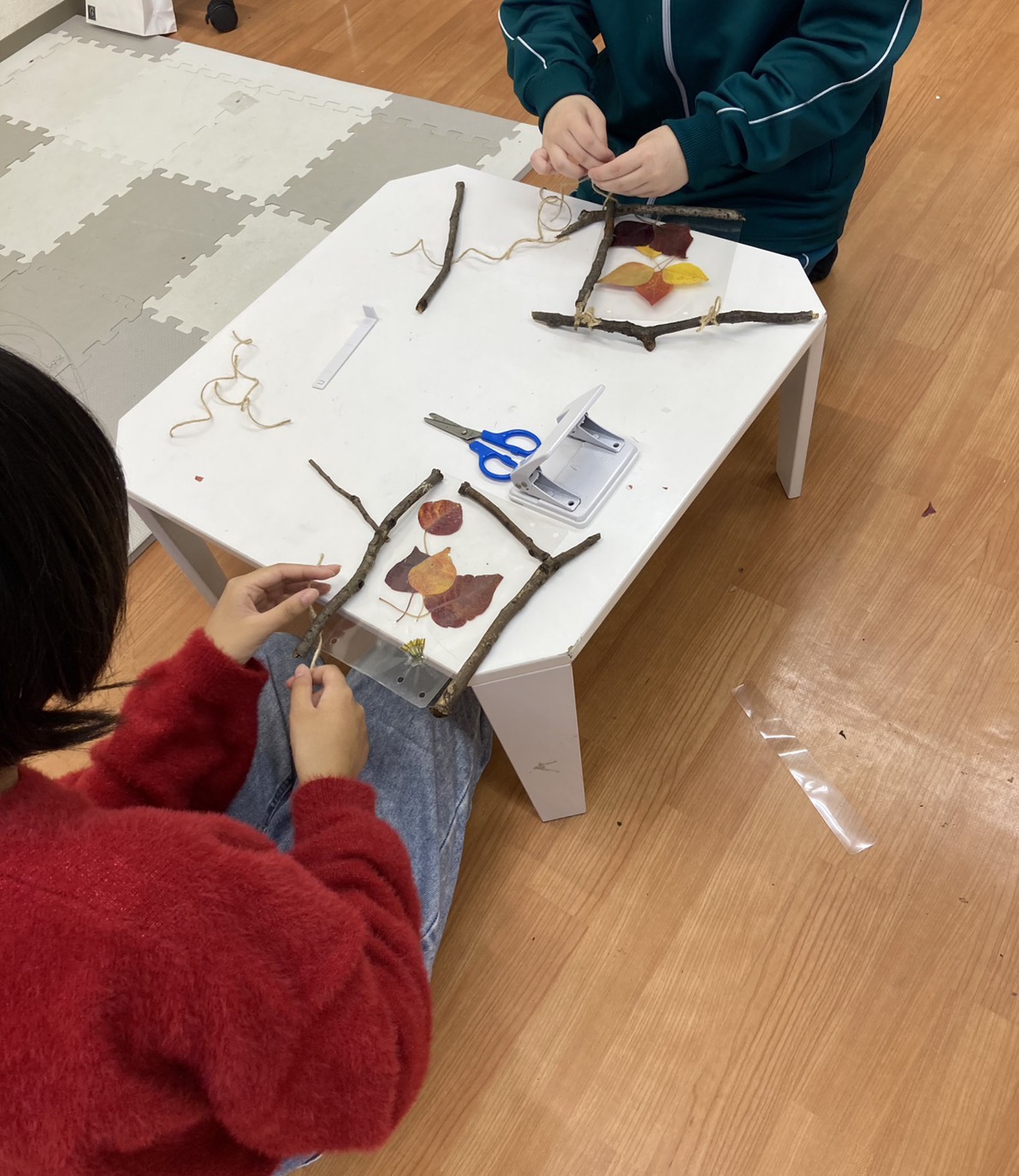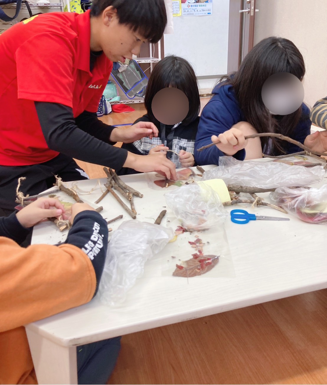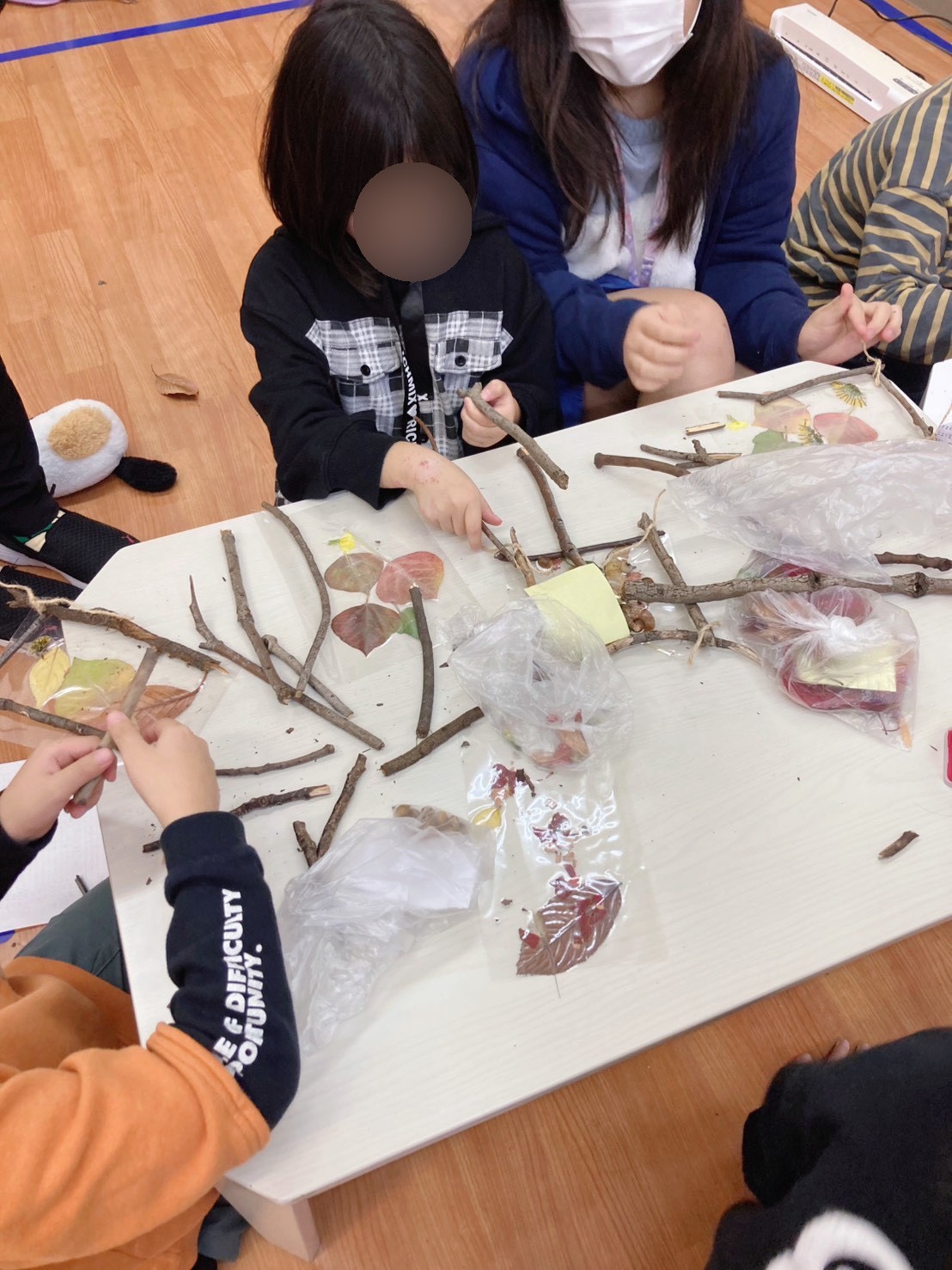 子どもたちは枝や紅葉の葉、どんぐりなど、