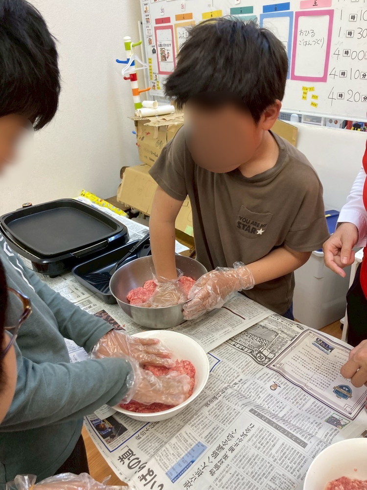 お昼ご飯は、みんなでミンチを『ねるねる』しハンバーグ作り。